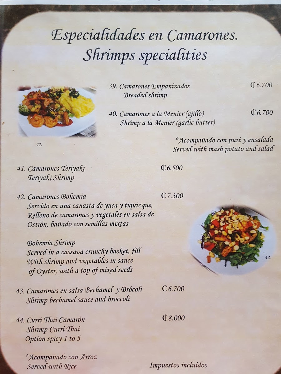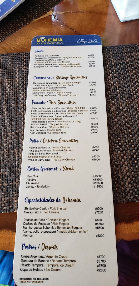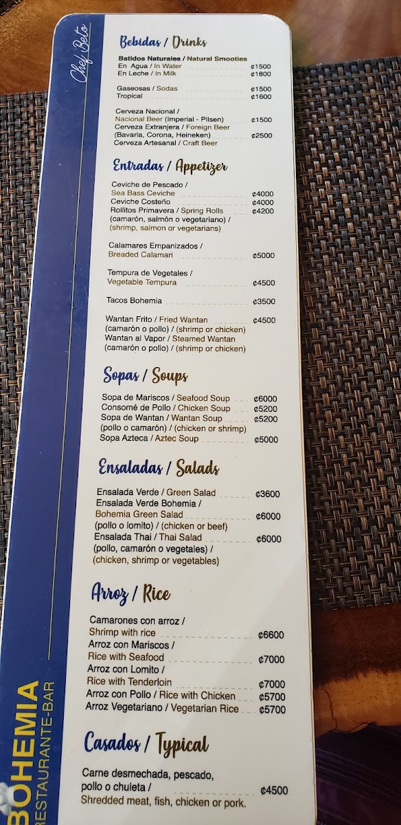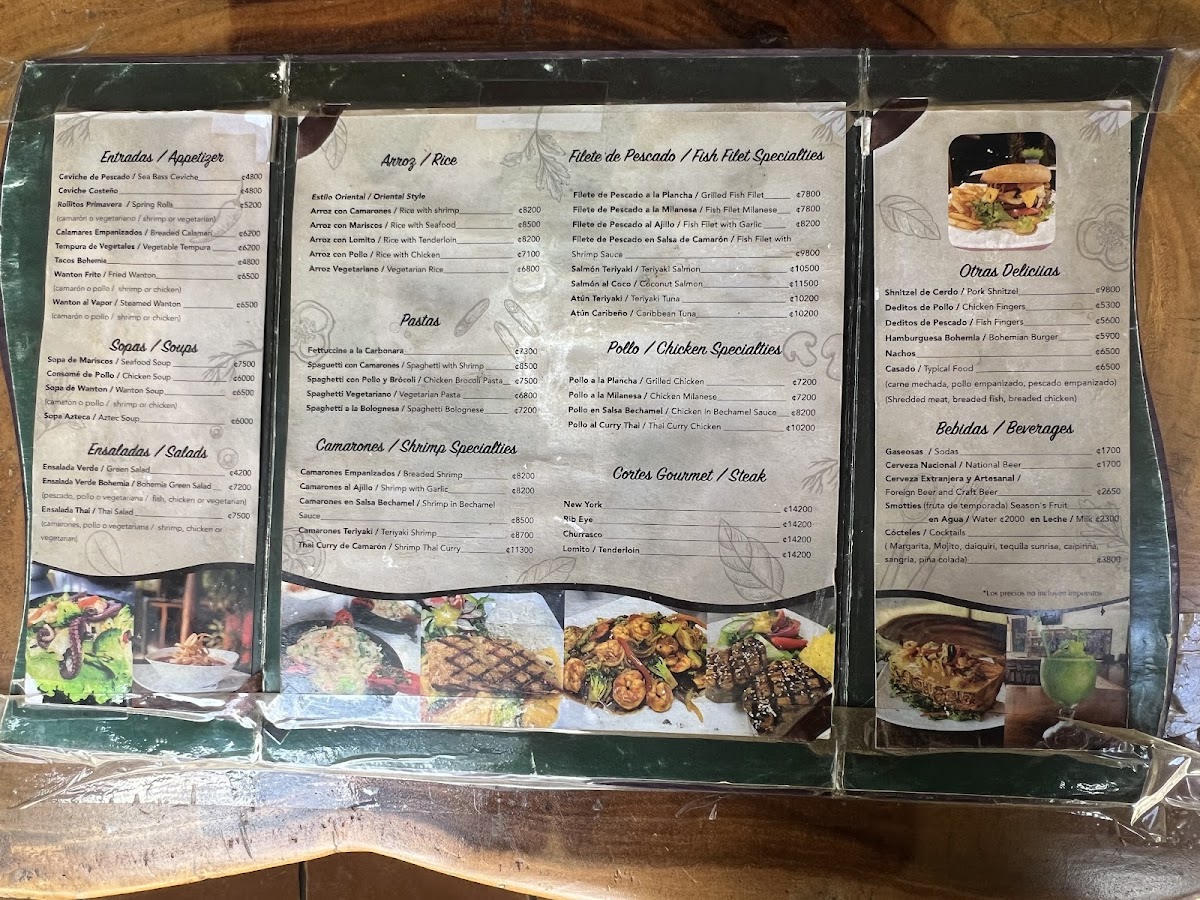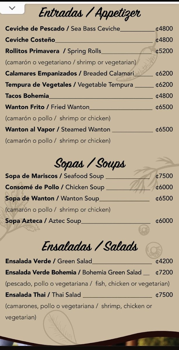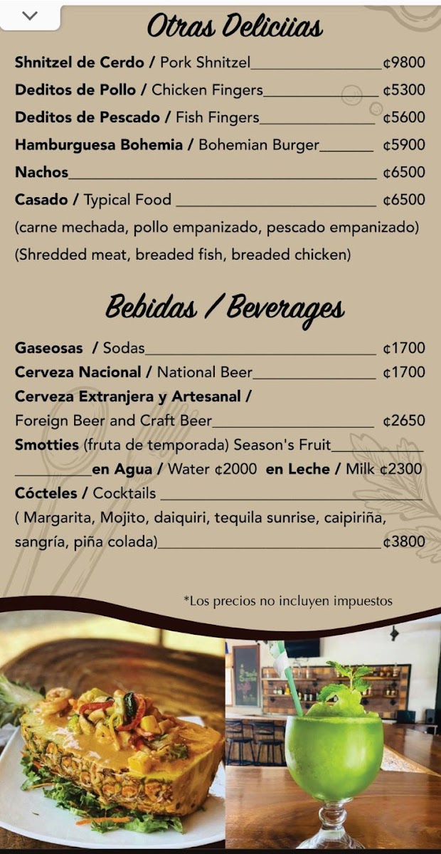 The menu at Bohemia Bar & Grill feels like a confident celebration of coastal flavors and comfort-food classics, with plenty of variety for both seafood lovers and hearty-meal seekers. Seafood clearly leads the experience: Grilled Red Snapper, Teriyaki Tuna, Sea Bass, and Carribean Tuna each bring their own personality-ranging from clean, grilled simplicity to bolder, sauce-forward profiles-while dishes like Seafood Soup, Ceviche de Pescado, and Seafood Fettuccine round out the ocean-driven side with options that are light, refreshing, or satisfyingly rich. If you’re craving something familiar and shareable, Tacos and Rollitos Primavera are easy picks, and Entrada Nachos Con Frijoles Molidos Cortesía del Restaurante adds a welcoming, casual touch that fits the bar-and-grill vibe. For those leaning toward bigger, meatier plates, Ribeye Steak Dinner and Schnitzel provide classic, filling alternatives, while traditional Costa Rican comfort shows up in Casado Con Carne En Salsa and Casado Con Pescado Empanizado-solid choices when you want a complete, balanced plate. Drinks and desserts finish things on a fun, indulgent note: Passion Fruit Ale offers a fruit-forward twist, and cocktails like Strawberry Mango Daquiri and Cadillac Margarita keep the mood festive, while sweets such as Helado de Mora Y Crema and Copa Helado Y Pastel de Caramelo bring a creamy, crowd-pleasing finale to the meal.